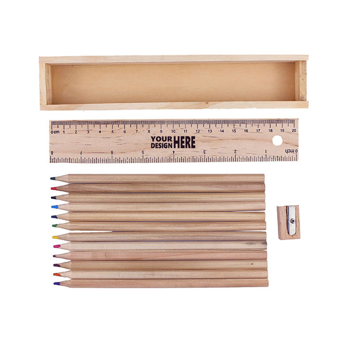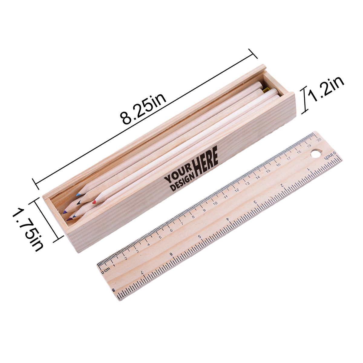 Additional InformationWooden pencil case with built in ruler holds 12 color pencil set for students and artists. Orders of 750 pieces or greater are eligible for sea shipping.